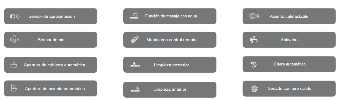 - · 15 funciones diferentes: Calefacción del asiento, chorro de agua para el lavado personal, secado con calefacción, sensor de aproximación, evacuación de agua automático, etc.